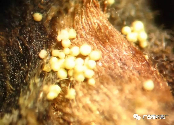 “金花”是在獨(dú)特的環(huán)境下,生長出來的一種益生菌類,又名“冠突散囊菌”。肉眼看上去,呈金黃色小顆粒狀。金花茂盛的六堡茶,催化多酚類化合物氧化,使茶葉苦澀味減少,茶葉品質(zhì)更醇甜,有著濃郁的菌花香,口感更順滑…