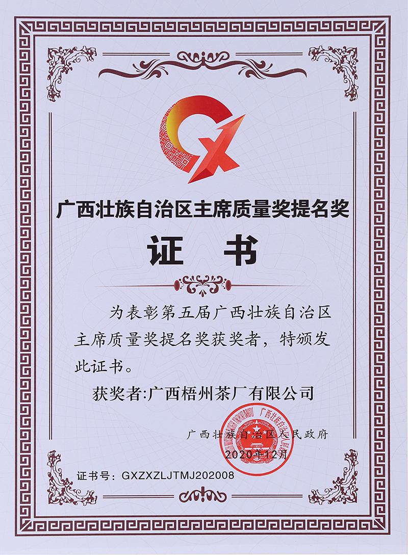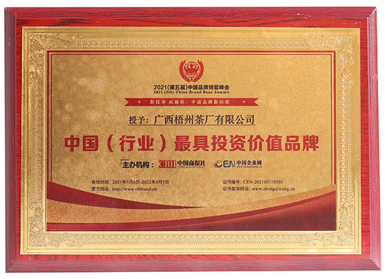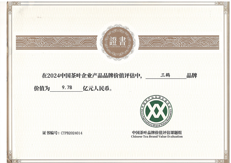 先進(jìn)的工藝、獨(dú)特的環(huán)境、堅(jiān)守的匠心,終獲市場(chǎng)肯定,茶友追捧。梧茶公司先后榮獲“中國(guó)茶葉學(xué)會(huì)茶葉科技示范基地”“國(guó)家知識(shí)產(chǎn)權(quán)優(yōu)勢(shì)企業(yè)”“高新技術(shù)企業(yè)”“全國(guó)實(shí)施卓越績(jī)效模式先進(jìn)企業(yè)”“廣西農(nóng)業(yè)產(chǎn)業(yè)化重點(diǎn)企業(yè)”“廣西文化產(chǎn)業(yè)示范基地”等,三鶴六堡茶是“國(guó)家生態(tài)原產(chǎn)地保護(hù)產(chǎn)品"“國(guó)家地理標(biāo)志保護(hù)產(chǎn)品”“中國(guó)黑茶(六堡茶)標(biāo)志性品牌”,榮獲“第三屆梧州市市長(zhǎng)質(zhì)量獎(jiǎng)”“第五屆廣西壯族自治區(qū)主席質(zhì)量獎(jiǎng)提名獎(jiǎng)”等榮譽(yù)。